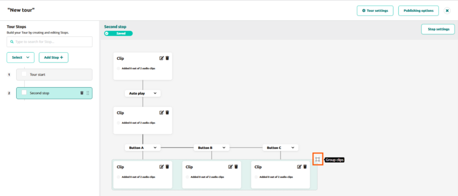 - Vous pouvez cliquer sur l'icône de groupe pour regrouper les clips et les dissocier. Les clips groupés partagent la connexion sortante, ce qui garantit que le clip suivant reste identique quelle que soit l'option choisie.
