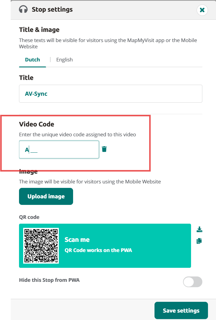Saisissez le code vidéo que vous avez choisi dans l'outil dans la case Code vidéo. Ajoutez également un identifiant que les visiteurs peuvent scanner.