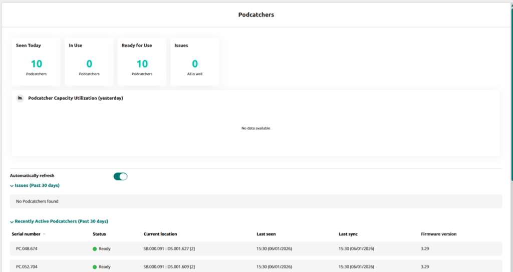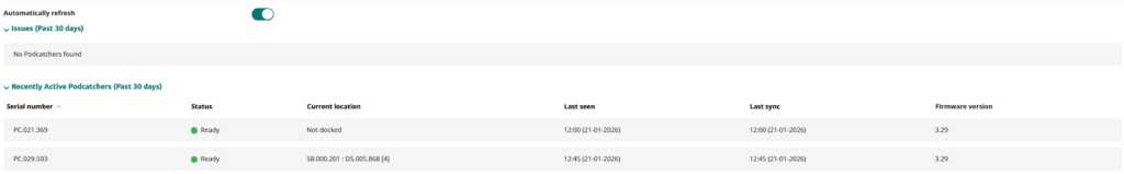 This list includes all Podcatchers assigned to your location, organized into three categories: