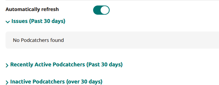- Issues (Past 30 days): Contains Podcatchers which have the status “Error” which have been seen within the past 30 days.