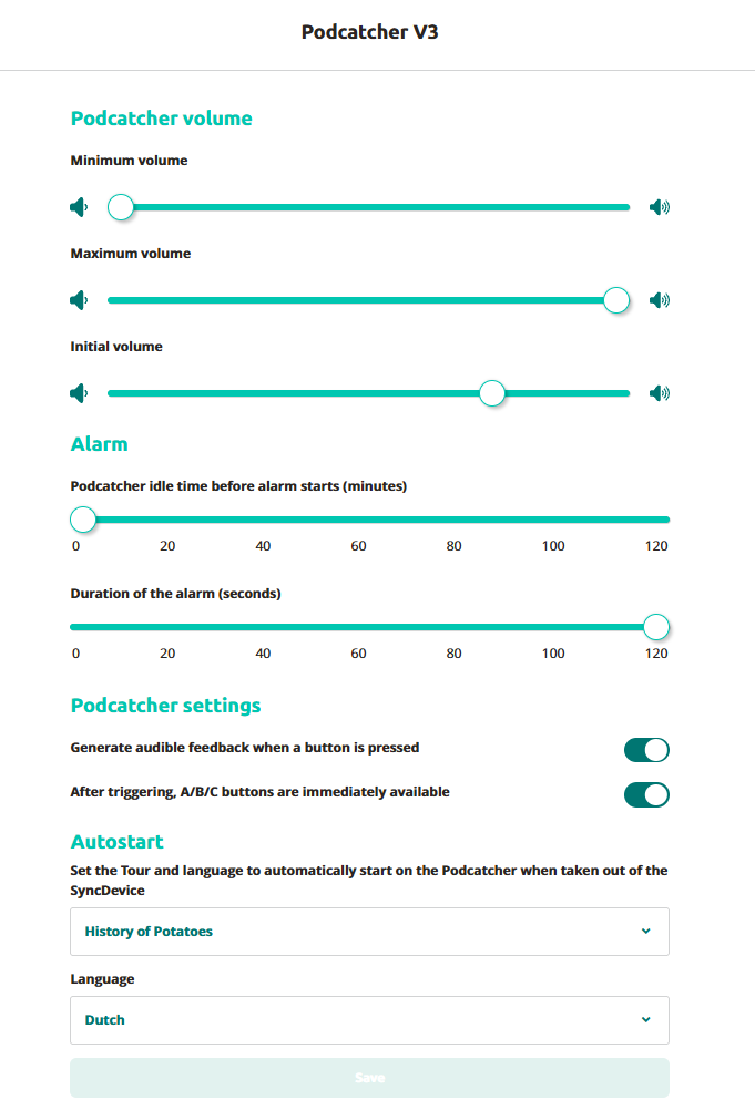 - Volume initial : Volume initial du Podcatcher lorsqu'il est sorti de son dock