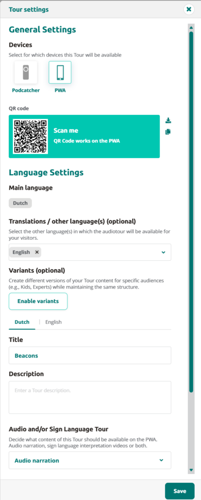 To use the QR code, copy or download the QR code from the tour settings. You can also find the QR code via Site Settings > PWA.