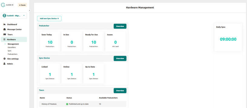 Within the hardware management page we see 4 sections: Podcatcher, Sync Device, Tours and Daily sync time.