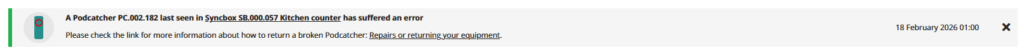 The Podcatcher may have been left out, used for testing, or returned but not yet processed in our system. For more information, see our Missing Podcatchers FAQ.
